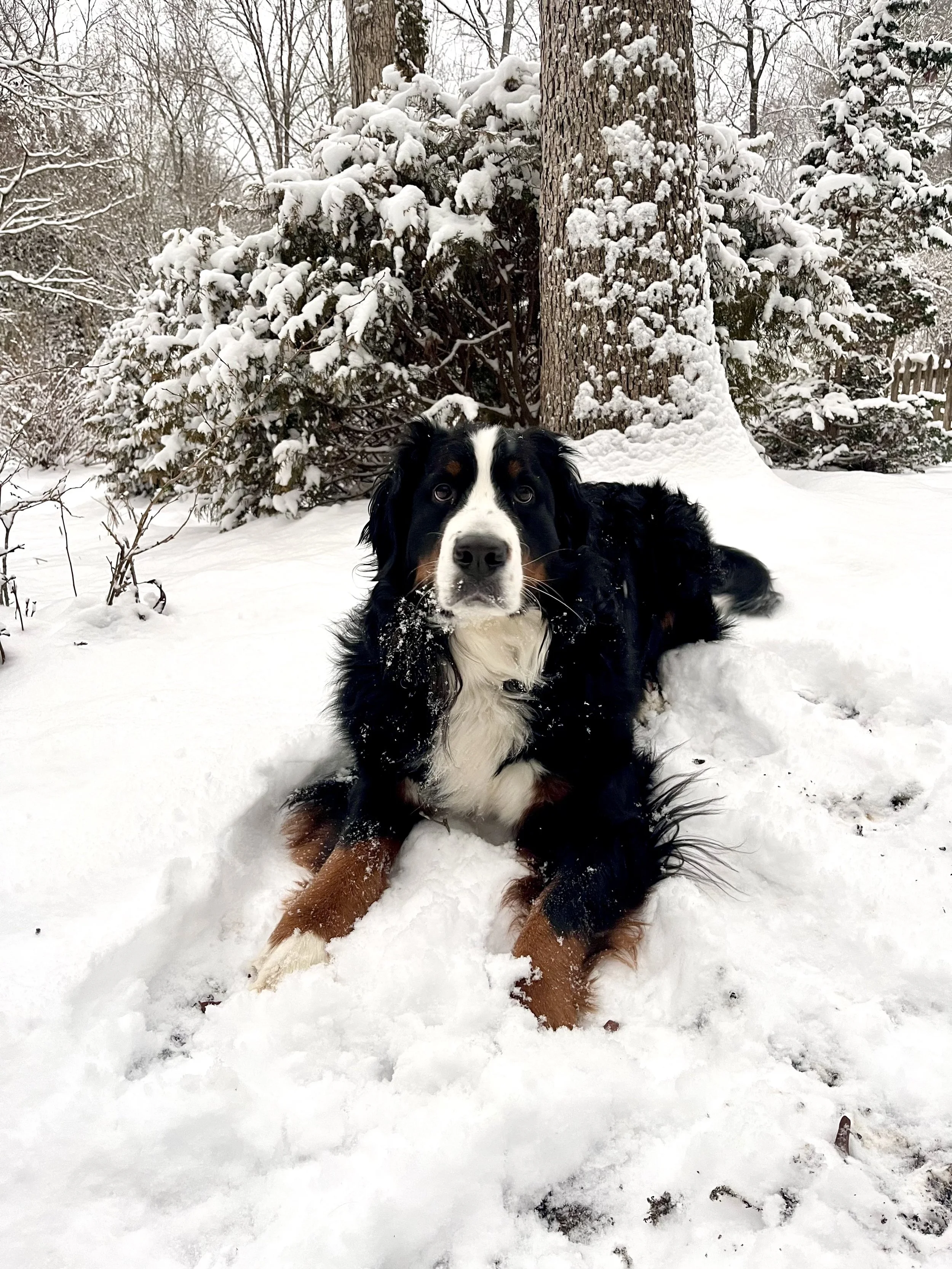 The snow-covered pup in the photo is Sitka, our sweet and goofy Berner (this was her first snow!). We love her, and her antics, dearly.